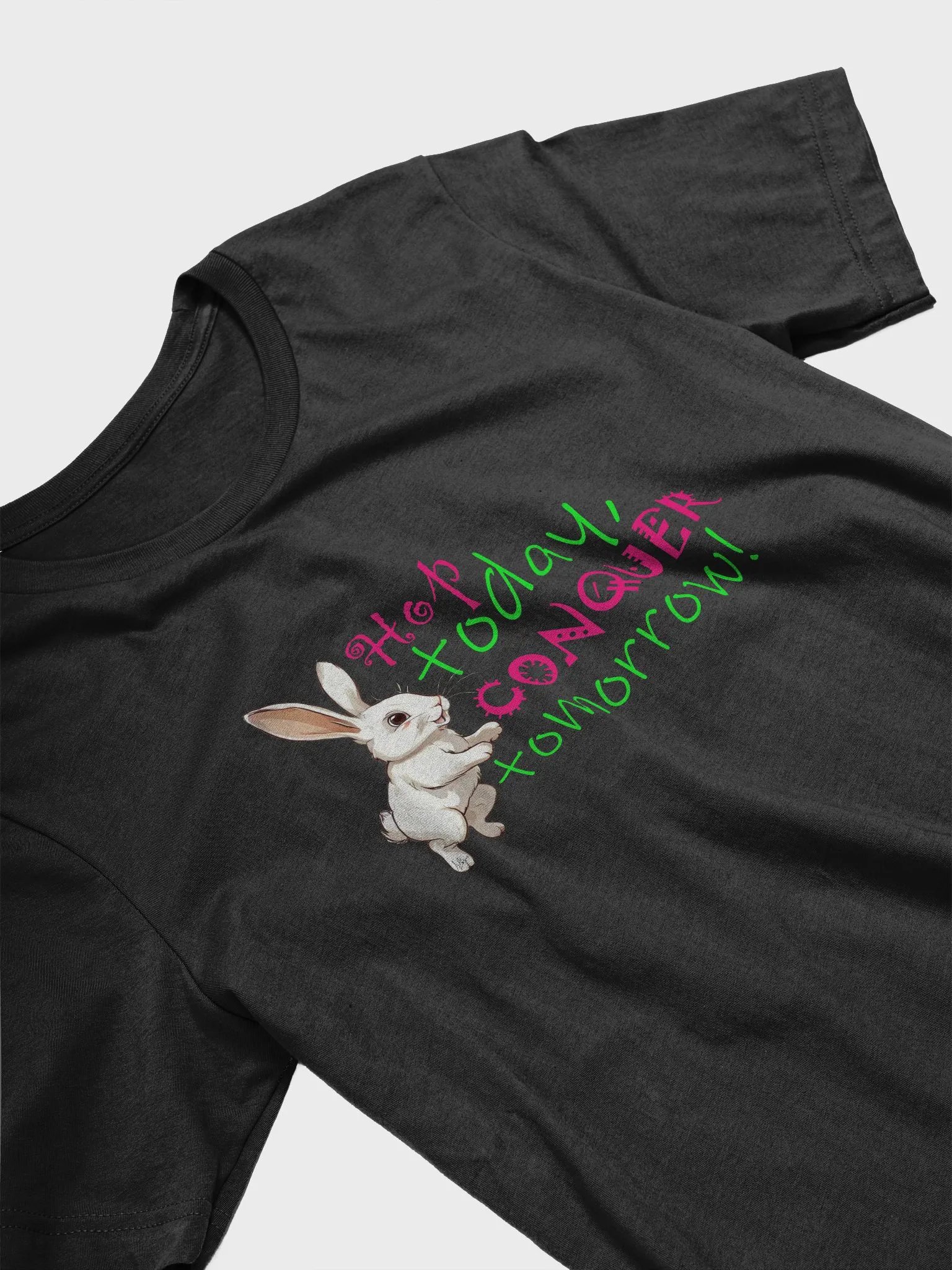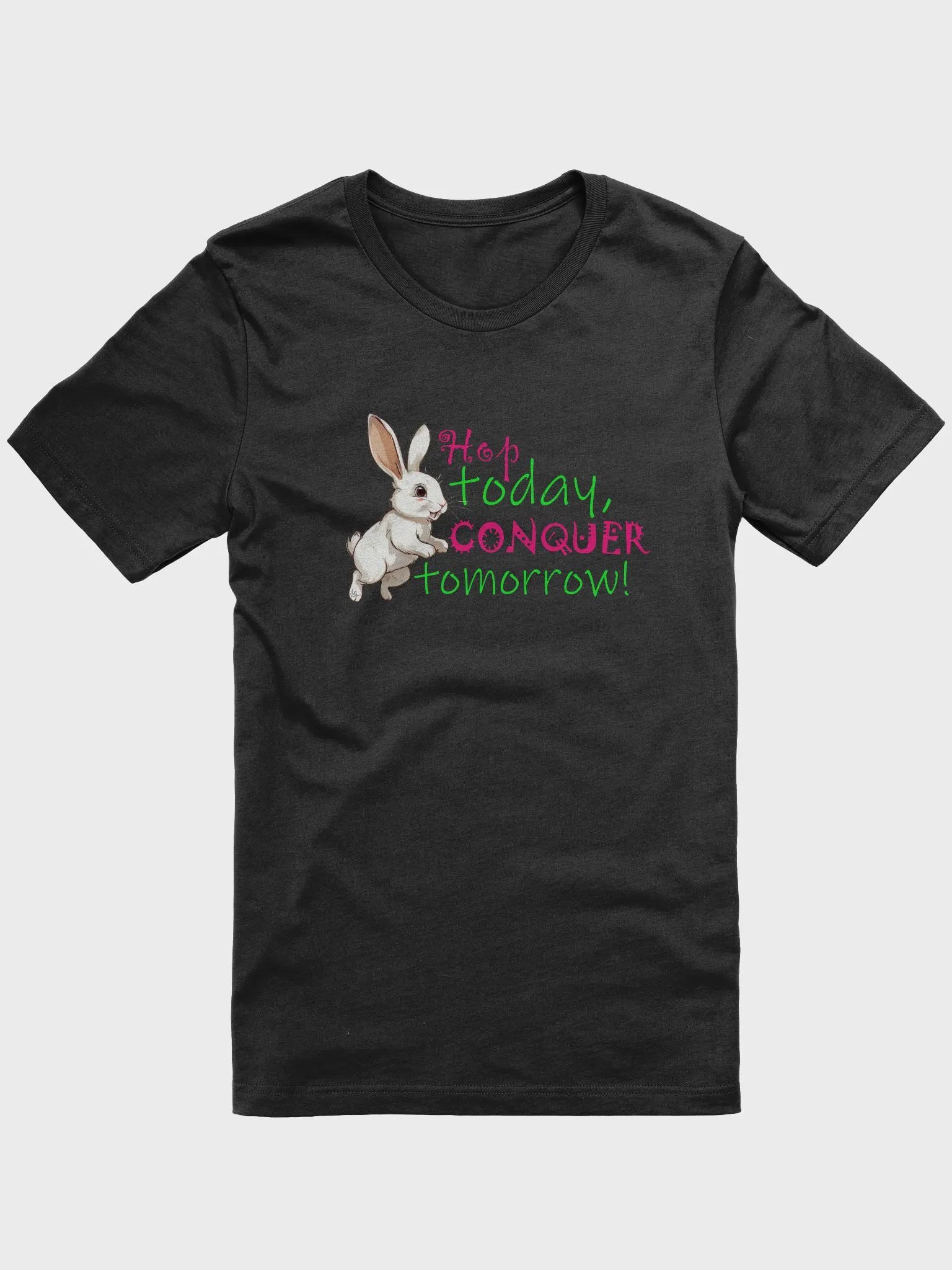 Start your day with a dose of motivation! This T-shirt features a cute rabbit mid-hop with the inspiring quote, "Hop today, conquer tomorrow." Perfect for adding a playful and uplifting touch to your everyday style.